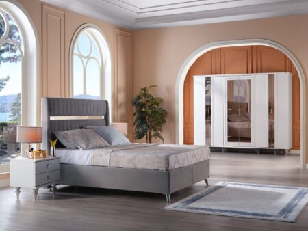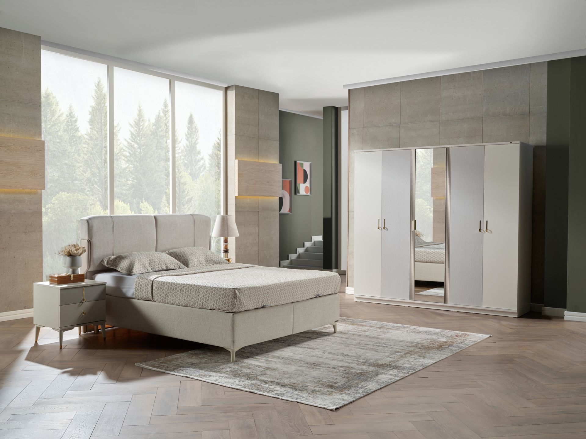 Das Alya-Schlafzimmerset kombiniert modernen Avantgarde-Stil mit der perfekten Harmonie der Creme-, Cappuccino- und Goldfarben und verleiht Ihren Schlafzimmern eine elegante und beeindruckende Note. Mit seinen stilvollen Details und dem funktionalen Design bietet es sowohl einen ästhetischen als auch komfortablen Wohnraum. Kombination aus Creme, Cappuccino und Gold: Der elegante Farbübergang verleiht Ihrem Raum eine edle Atmosphäre. Dieses feine Detail, das sich im gesamten Set findet, rundet das Design stilvoll ab. Elegante goldfarbene Metallgriffe und speziell gestaltete Beine unterstreichen den modernen Avantgarde-Stil. Das in den Einheiten verwendete Textildruckmuster verleiht dem Design eine optische Fülle. Langsam schließende Deckelmechanismen sorgen für eine geräuschlose und funktionale Nutzung. Es wird aus umweltfreundlichen Materialien hergestellt, die keine gesundheitsschädlichen Stoffe enthalten. Das Alya-Schlafzimmerset bringt mit seinem eleganten Design, dem modernen Avantgarde-Stil und der Farbharmonie sowohl Eleganz als auch Komfort in Ihr Schlafzimmer. Mit seinen ästhetischen Details und funktionalen Eigenschaften bietet es eine ideale Wahl für alle, die eine elegante Atmosphäre in ihrem Schlafzimmer schaffen möchten.