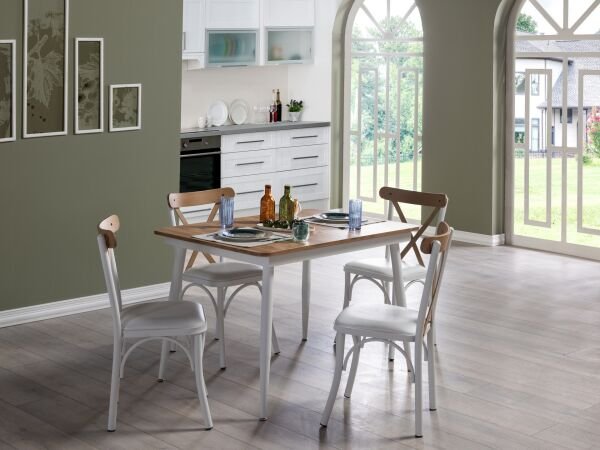 Das Essen Küchentisch-Set ist eine stilvolle Option, die eine elegante Atmosphäre bietet, indem es die wärmste Version der Holzoptik mit weißer Farbe kombiniert. Dieses Set besteht aus vier Stühlen und einem ausziehbaren Tisch und bietet sowohl Ästhetik als auch Funktionalität.