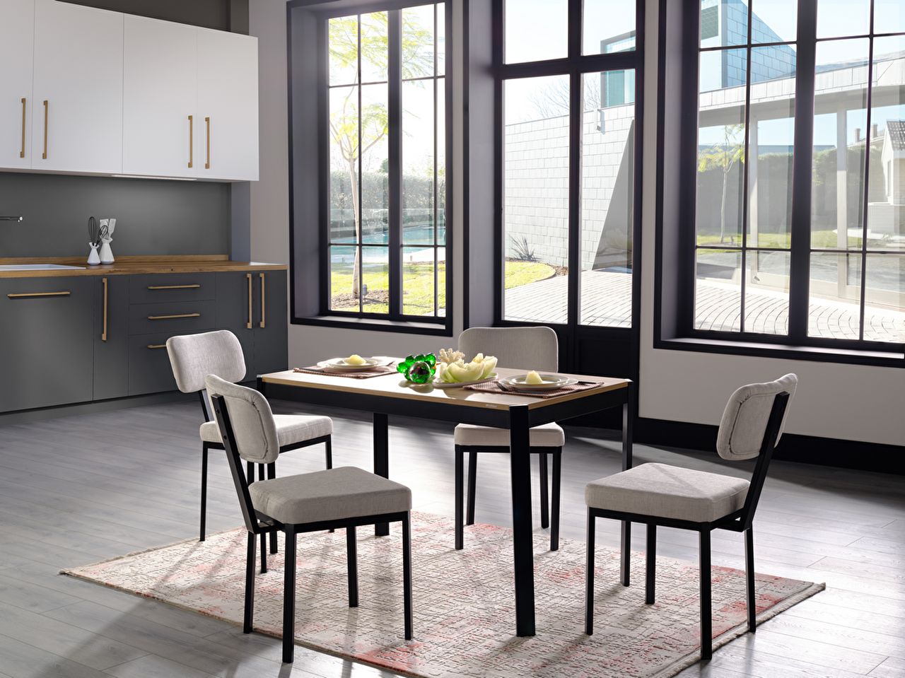 Das Floyd Küchentisch-Set verleiht Ihrer modernen Küche mit seinem schlichten und stilvollen Design einen ästhetischen Mehrwert. Die Harmonie der grauen Stühle mit dem Walnusstisch wird durch schwarze Details ergänzt und schafft einen auffälligen Kontrast. Dieses Tischset ist eine ideale Option für alle, die eine Küche suchen, die sowohl minimalistisch als auch funktional ist.