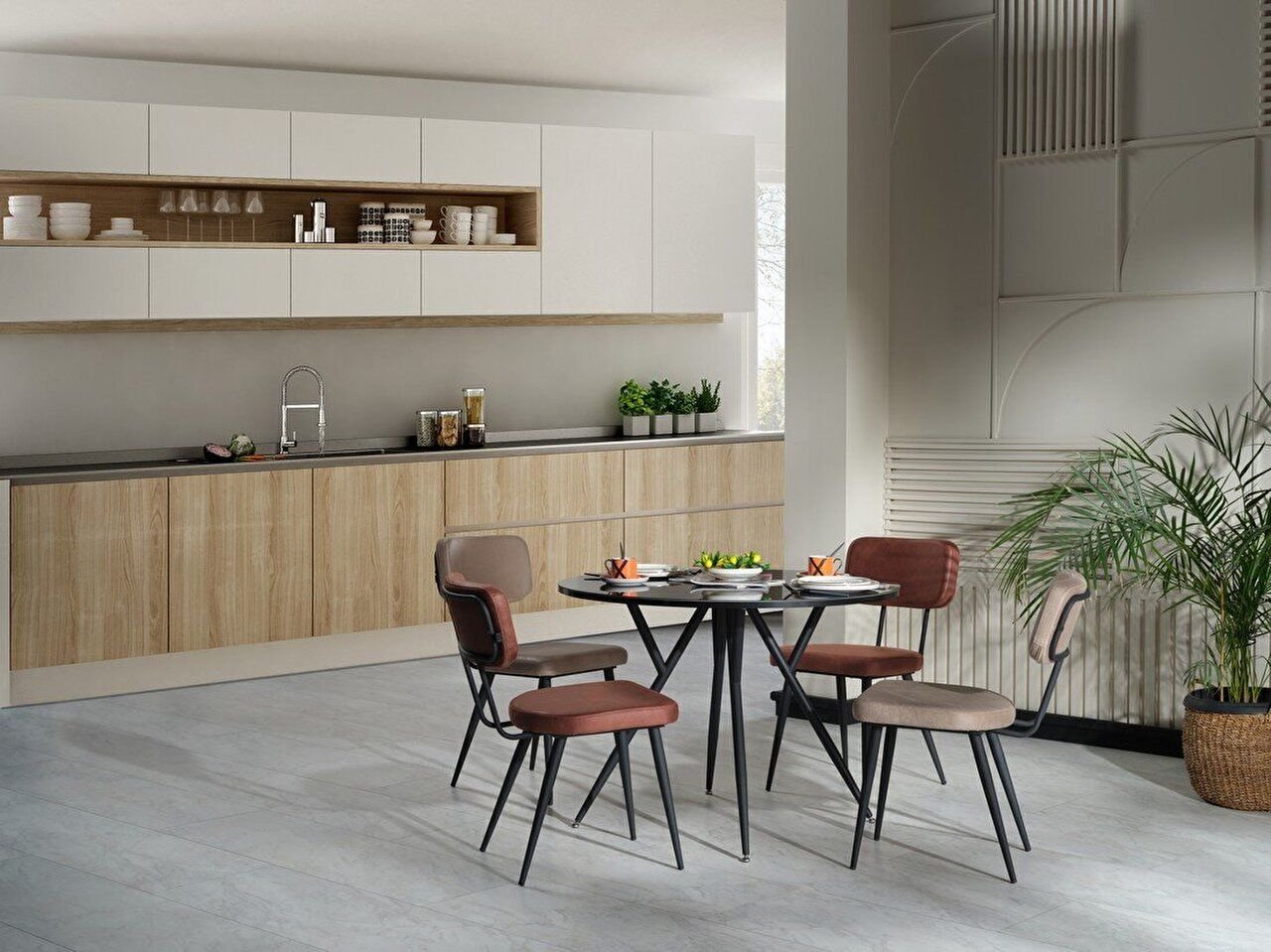 Das Halley Küchentisch-Set verleiht Ihrer Küche mit seinem sportlichen und modernen Design Energie. Die runde Tischform und die um ihn herum angeordneten fliesen- und nerzfarbenen Stühle verleihen Ihrer Küche Eleganz und Lebendigkeit. Stühle in Nerz- und Ziegeltönen sorgen in Kombination mit dem schwarzen Tisch für stilvolle Kontraste und sorgen für eine moderne Atmosphäre.
