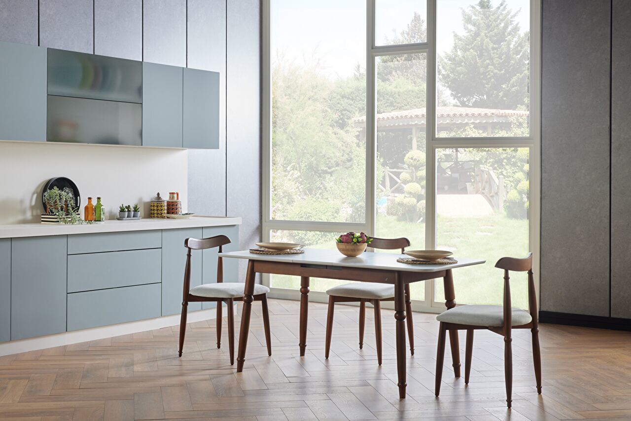Das Merlin Küchentisch-Set bringt mit seinem natürlichen und nostalgischen Design den ländlichen Dekorationsstil in Ihre Küche. Während es mit der Wärme seiner Holzstruktur und den eleganten Details eine angenehme Atmosphäre in Ihre Küche bringt, bietet es mit seiner langlebigen Struktur eine langlebige Nutzung. Natürliches und warmes Design: Das Tischset Merlin, in dem die Holzfarbe dominiert, schafft eine warme und freundliche Atmosphäre in der Küche. Es passt sich jedem Raum mit drei verschiedenen Formoptionen an: fest, offen und rund. Die in der Tischplatte verwendete 18-mm-MDF sorgt mit ihrer soliden Struktur für Langlebigkeit. Speziell entwickelte Beine aus Buchenholz sorgen für eine lange Nutzungsdauer. Materialien, die nach E1-Standards hergestellt werden, enthalten keine gesundheitsschädlichen Stoffe. Es ist kratz-, reibungs- und brennfest und verfügt über eine leicht zu reinigende Struktur.
