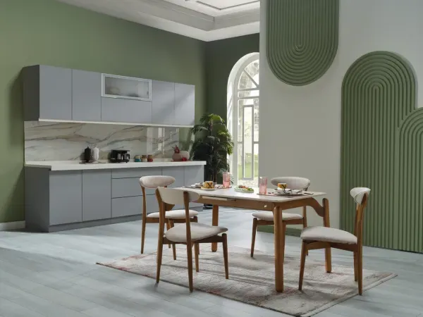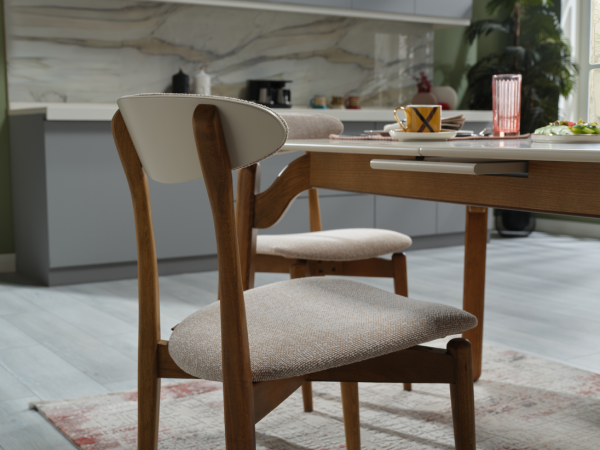Das Küchentischset Nora verleiht Ihrer Küche Eleganz und Wärme, indem es die natürliche Eleganz von Holz mit einem minimalistischen Designansatz kombiniert. Dieses Set, das durch seine eleganten und edlen Linien auffällt, bietet mit seinen funktionalen Eigenschaften und seiner langlebigen Struktur sowohl eine ästhetische als auch praktische Lösung.